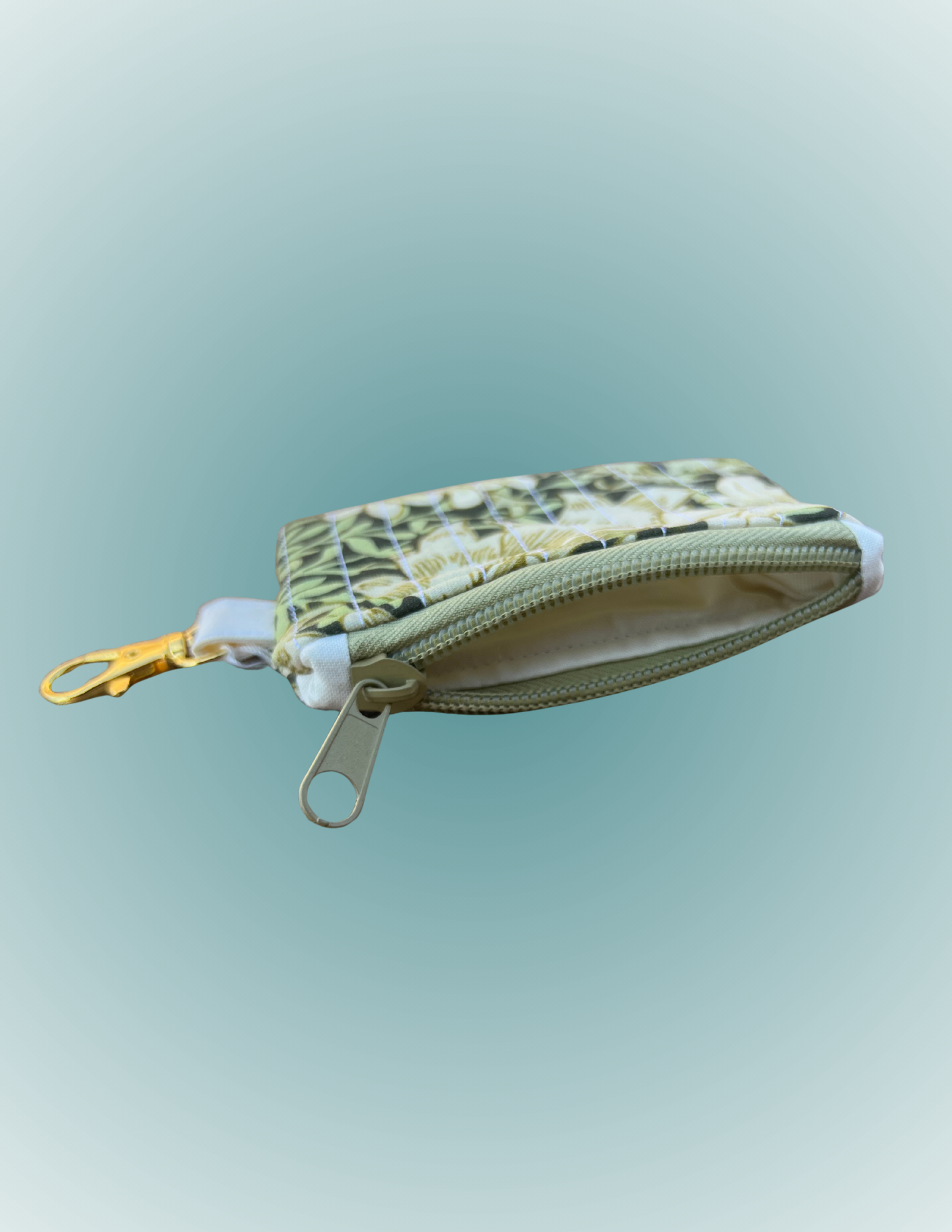 Carry elegance with you wherever you go with this wallet-style pouch, featuring swirling green and beige chrysanthemums inspired by coastal gardens. Perfectly sized to hold cards, cash, and small essentials, it also comes with a convenient keychain to clip to your bag or keys.
