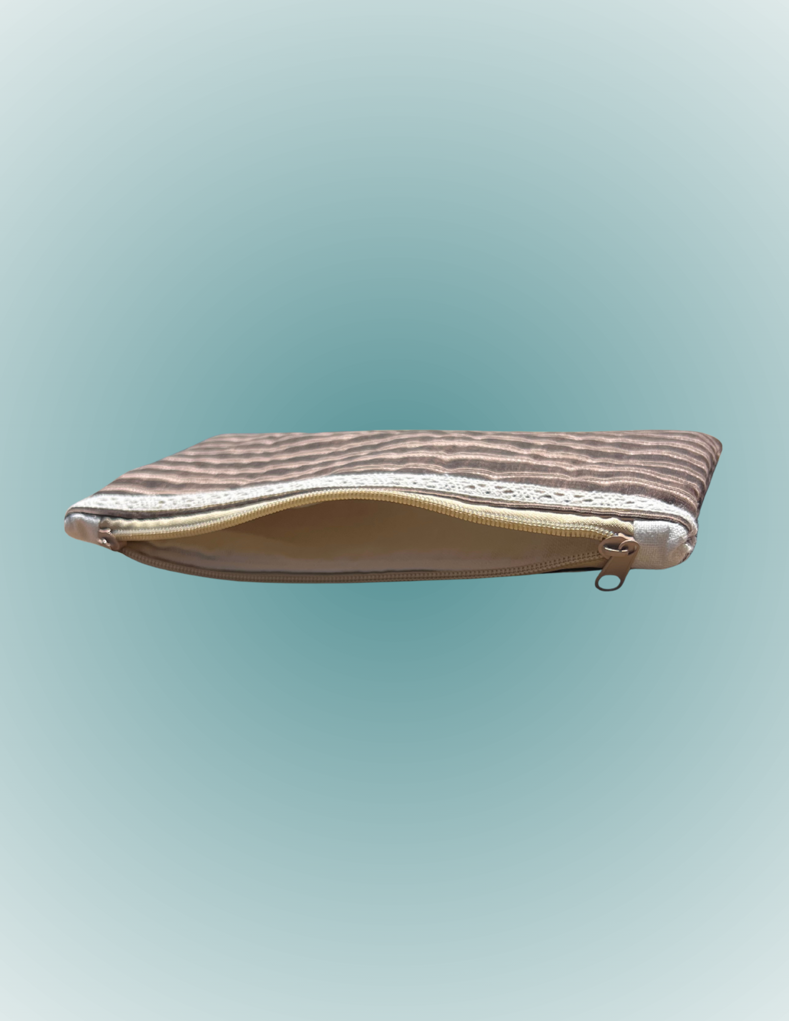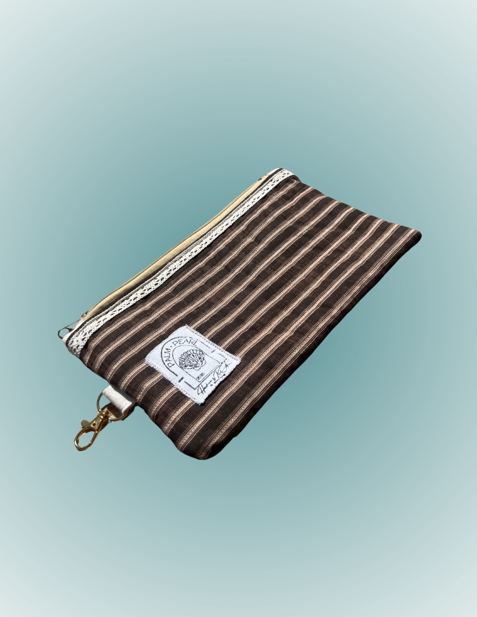Coastal-inspired and effortlessly chic, this pouch features muted tan and white stripes reminiscent of a small cup of espresso on the shore. Accented with delicate boho lace trim just under the zipper, it adds a subtle, handcrafted charm to a versatile, roomy pouch. Perfect for sunglasses, small accessories, or everyday essentials, it’s a stylish addition to any seaside-inspired collection.