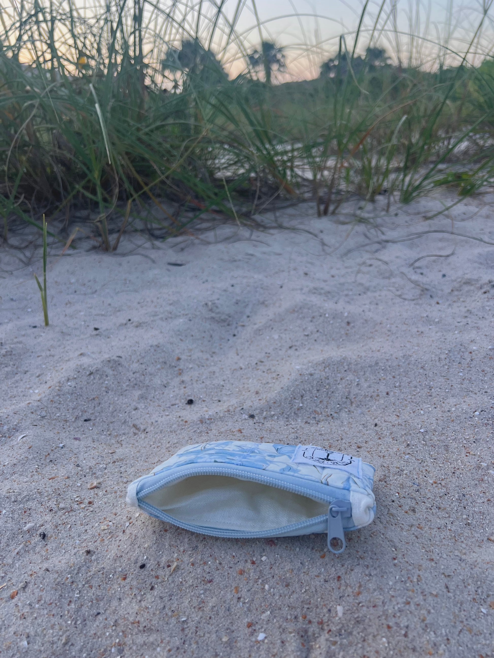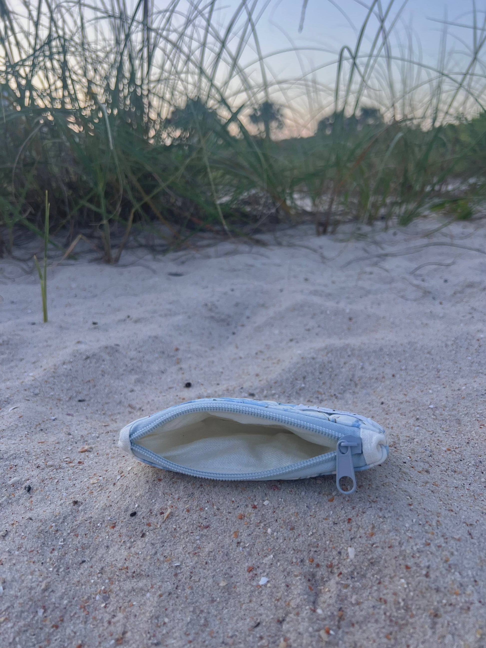 A compact pouch for gloss, earbuds, or small essentials. The perfect companion to the boxy pouch or your favorite beach tote.