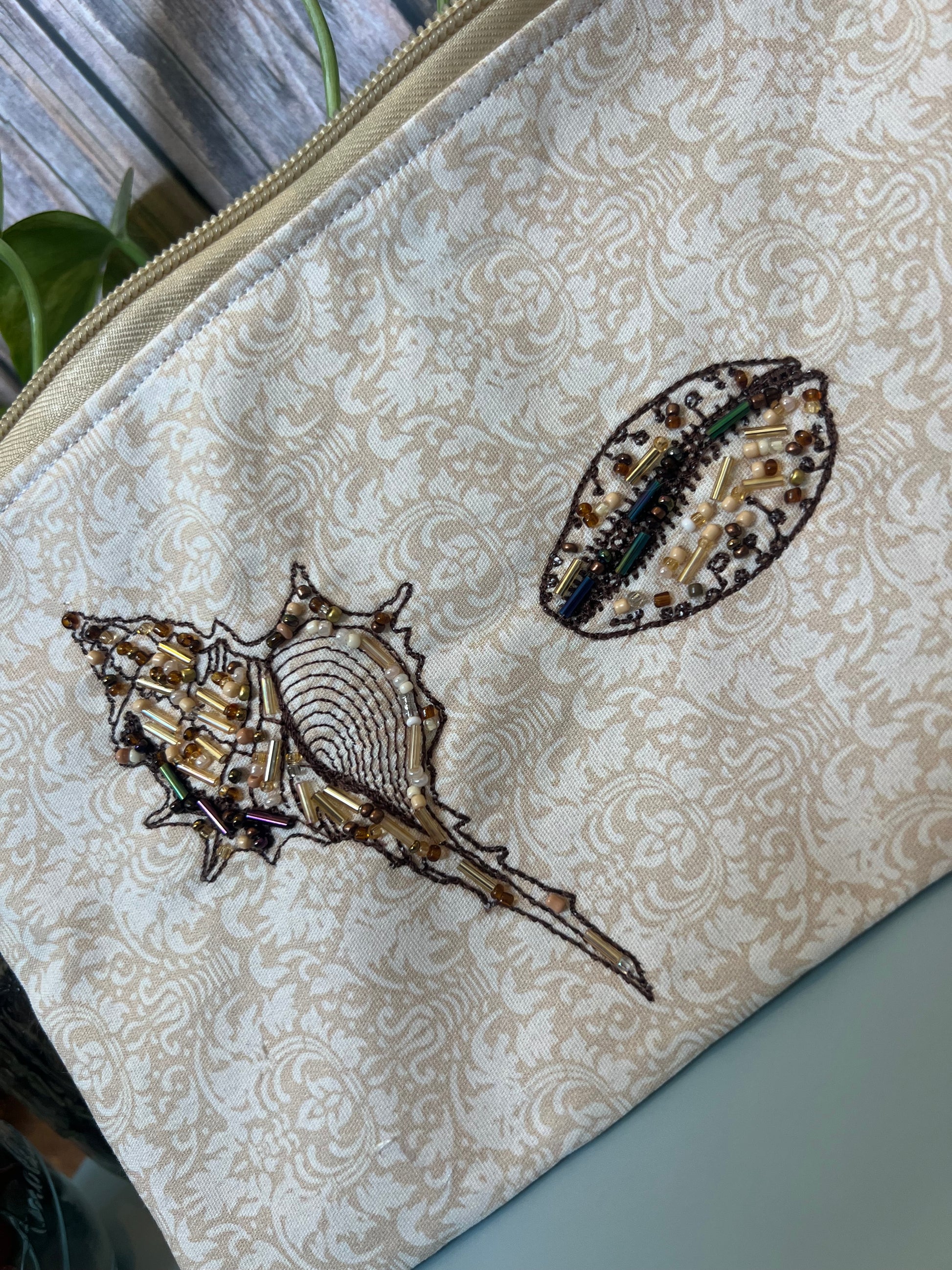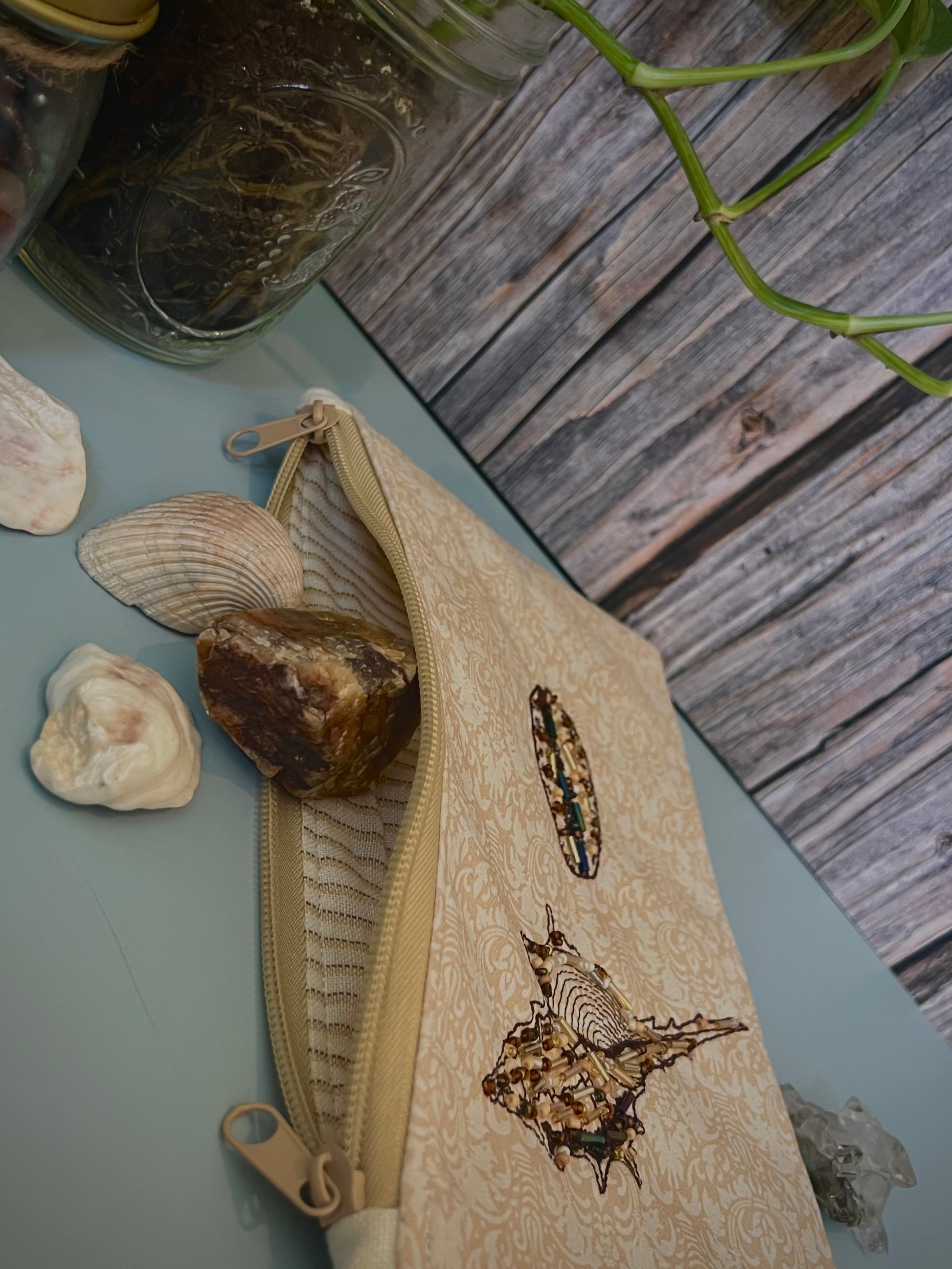 Warm, radiant, and one-of-a-kind—our Golden Tide pouch captures the magic of a sun-drenched shoreline. Handcrafted on an elegant tan base fabric, this medium-sized zip pouch features an embroidered conch and cowrie shell, each hand-beaded with shimmering golden, tan, and iridescent hues of purple and amber. The result is a soft, luminous texture that glows like sunset on the sand.