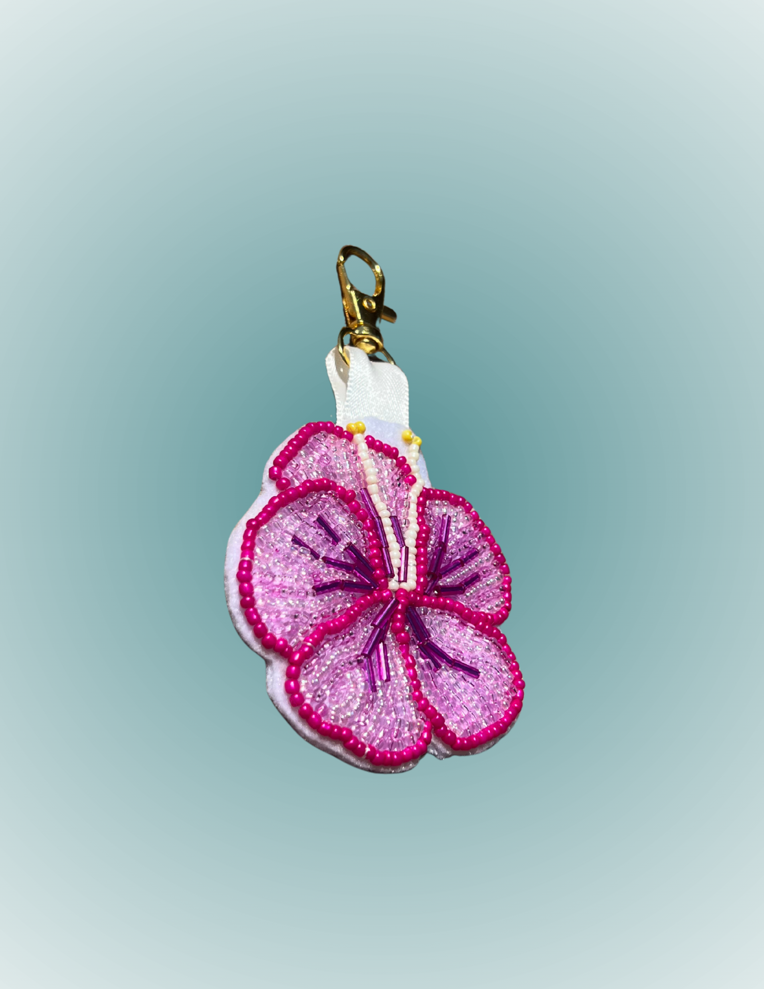 Brighten your bag with this delicate hand-beaded pink hibiscus flower charm. Each tiny glass seed bead is carefully sewn by hand, creating a vibrant floral design that catches the light beautifully. The intricate beadwork takes time and patience, making every charm a true one-of-a-kind piece. Perfect for adding a touch of tropical elegance to your favorite tote, backpack, or purse, this charm brings handcrafted coastal charm wherever you go. 🌺