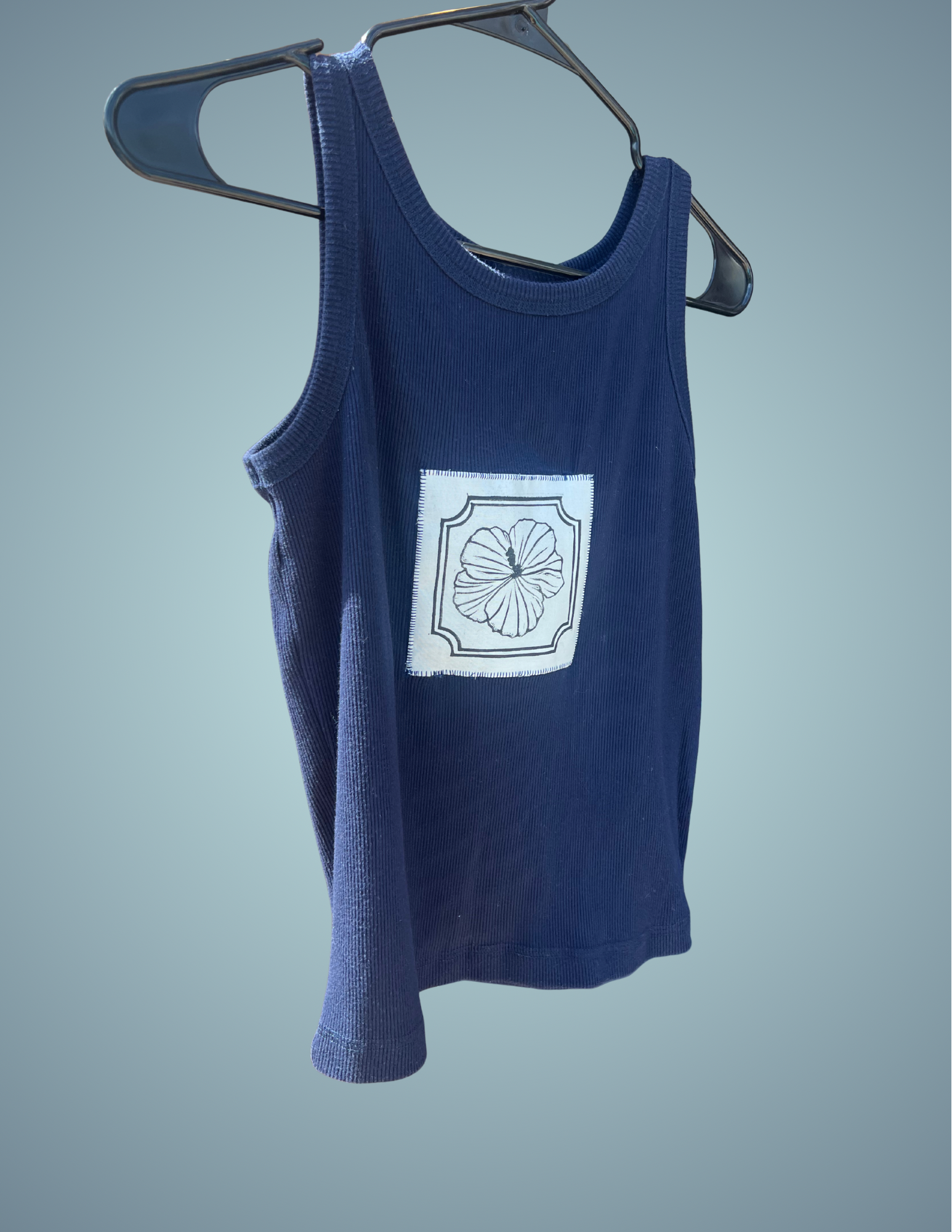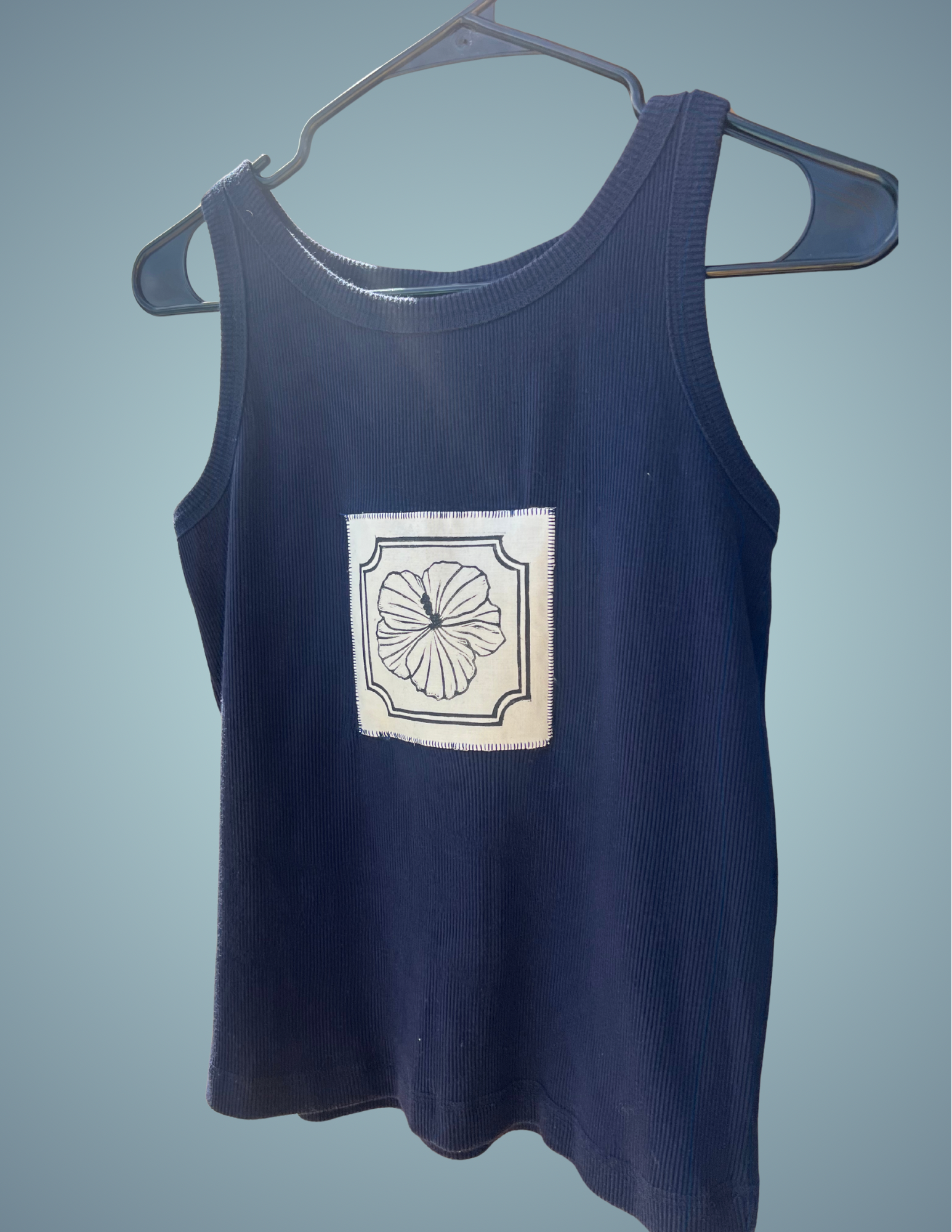 Handmade and one-of-a-kind, this navy blue tank top is elevated with a tropical touch. A lino-cut printed hibiscus flower is hand-stamped onto fabric and stitched on as a patch, giving the piece an artistic, coastal vibe. Sized Medium with a comfortable fit, it’s the perfect warm-weather top for casual days, beach outings, or layering with your favorite pieces.