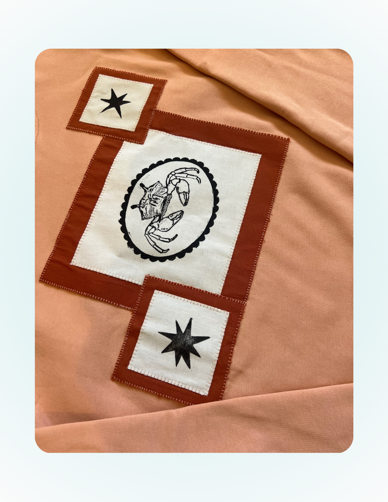 This one-of-a-kind hoodie blends handmade detail with coastal color. A hand-carved, hand-printed linocut fiddler crab is pressed onto off-white cotton and set against a rust orange background before being sewn onto a thick, bright peach crewneck hoodie. The warm tones and beach-inspired print give it an easy, sun-soaked feel — perfectly relaxed and full of character. Sized for an adult M/L, each piece is printed, stitched, and finished by hand, so no two are ever exactly alike.