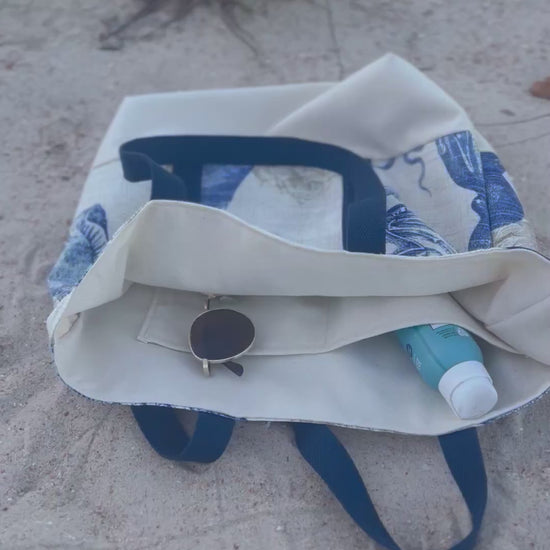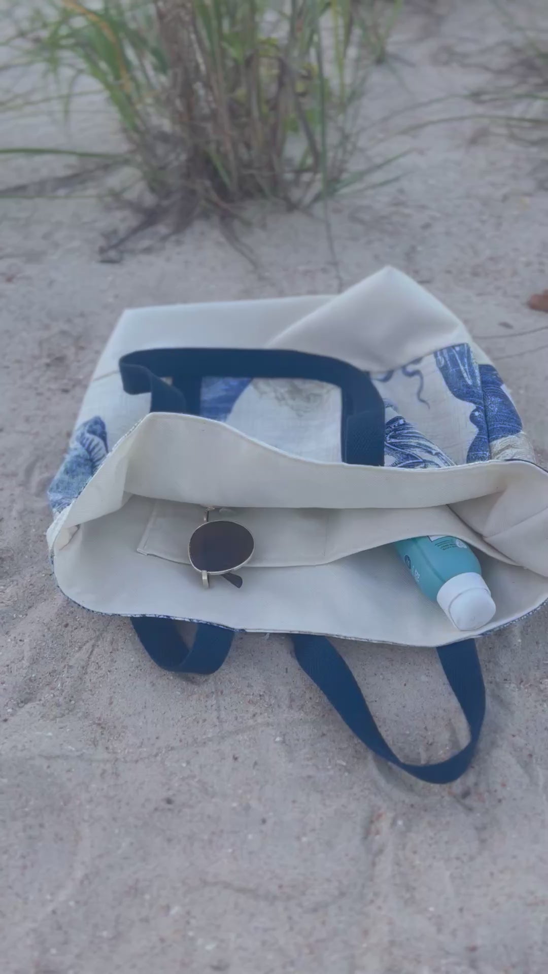 Meet your go-to bag for salty air adventures and sunny errands. This roomy tote features a bold mix of royal/navy blue and sandy tan tones, printed with delicate sea life and shell illustrations that capture the magic of the coast. It’s fully lined with thoughtfully placed inside pockets to keep your beach day or shopping haul organized and breezy.