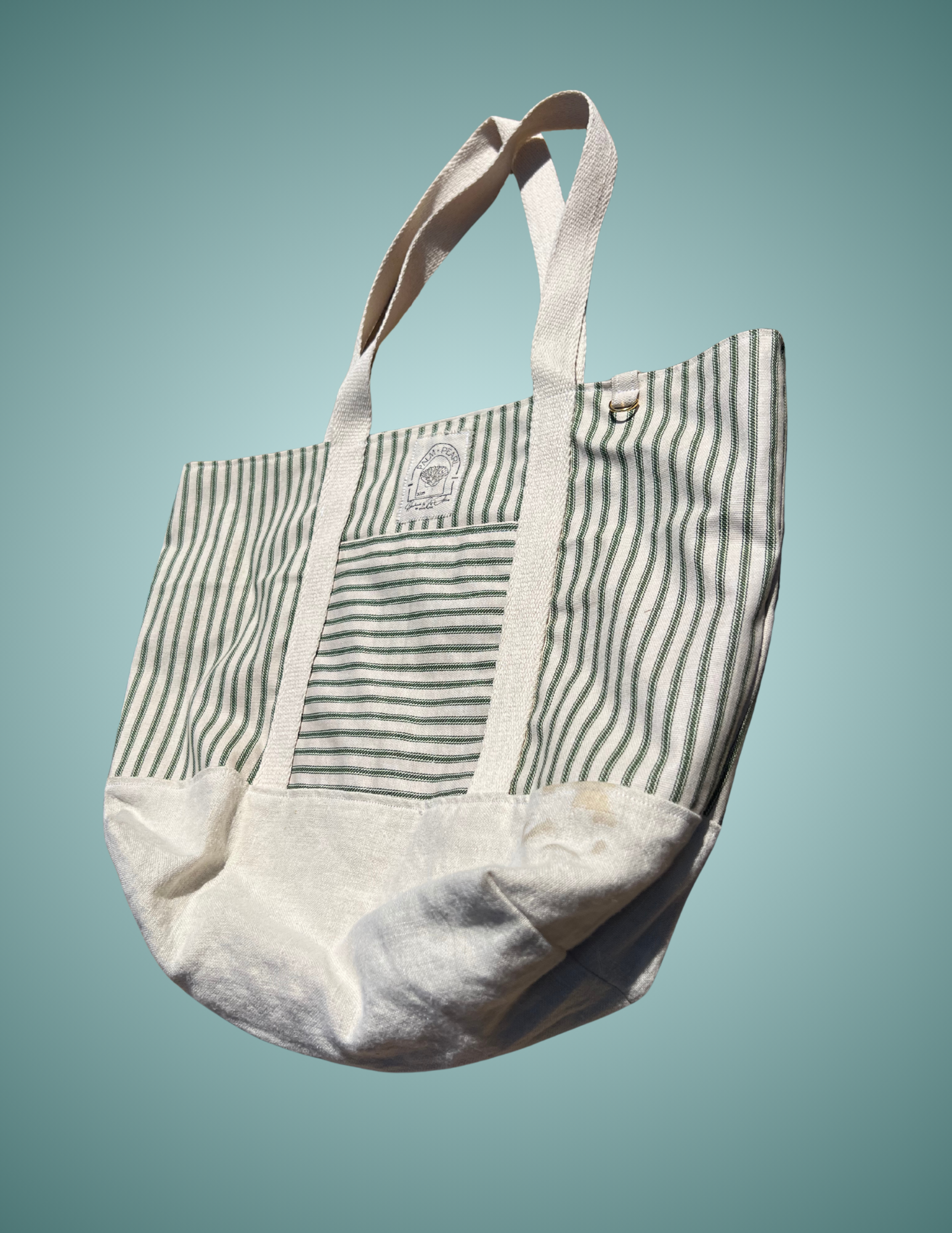 Fresh, breezy, and effortlessly coastal, this tote bag features soft beige fabric with delicate green pinstripes, evoking the gentle sway of seaside grasses. Spacious and versatile, it’s perfect for beach days, market trips, or everyday essentials, bringing a relaxed, coastal charm to every outing.