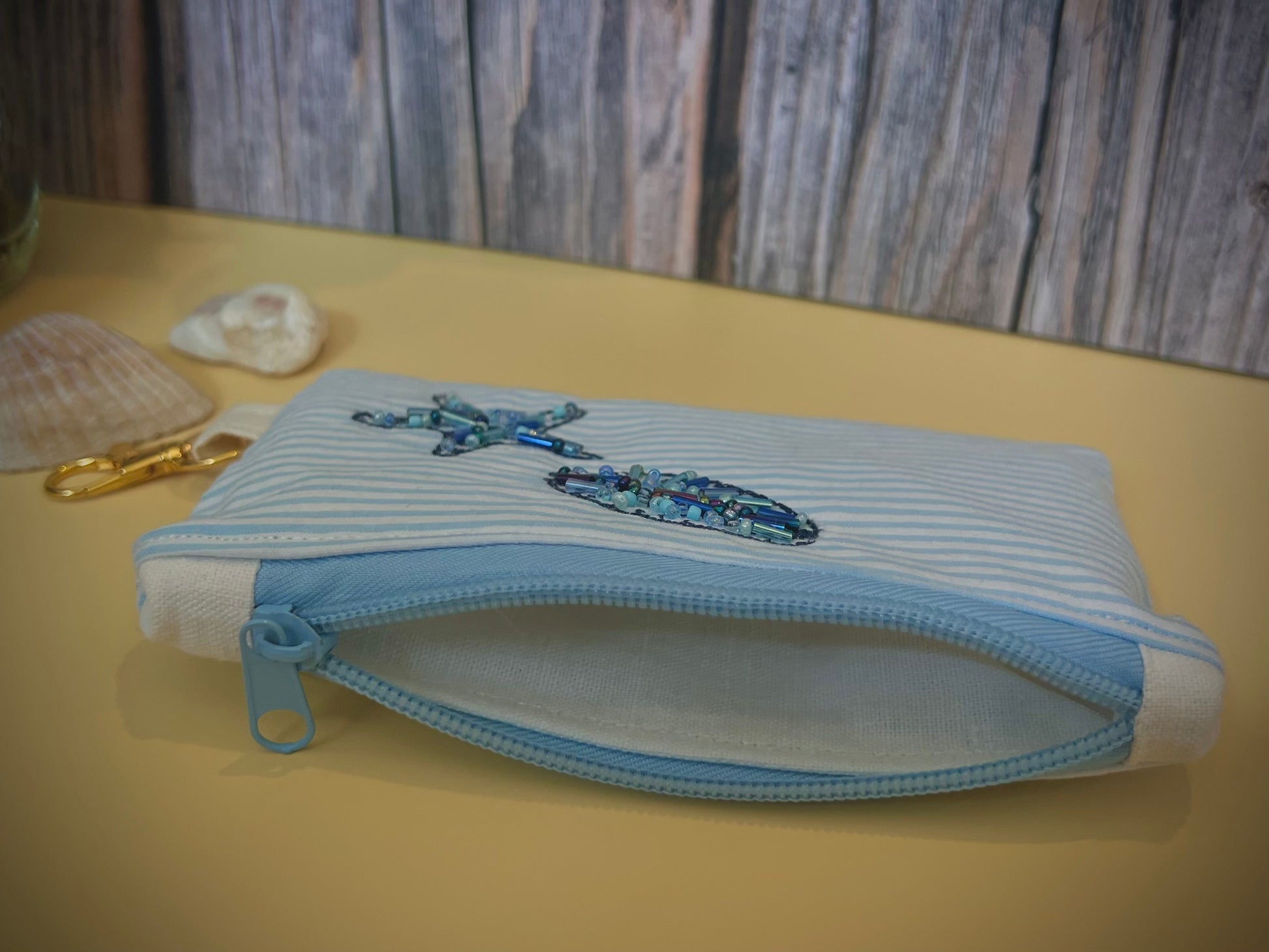 Soft stripes, shimmering details, and salty-sweet charm—Shoreline Sparkle is a true coastal cutie. This small zip pouch is made from crisp white and blue striped fabric and features a hand-embroidered starfish and cowrie shell, brought to life with delicate, hand-placed beads in pearly gold, royal blue, and violet iridescent shimmer.