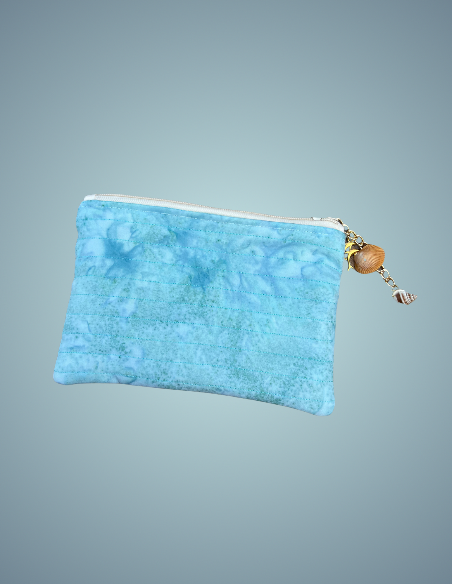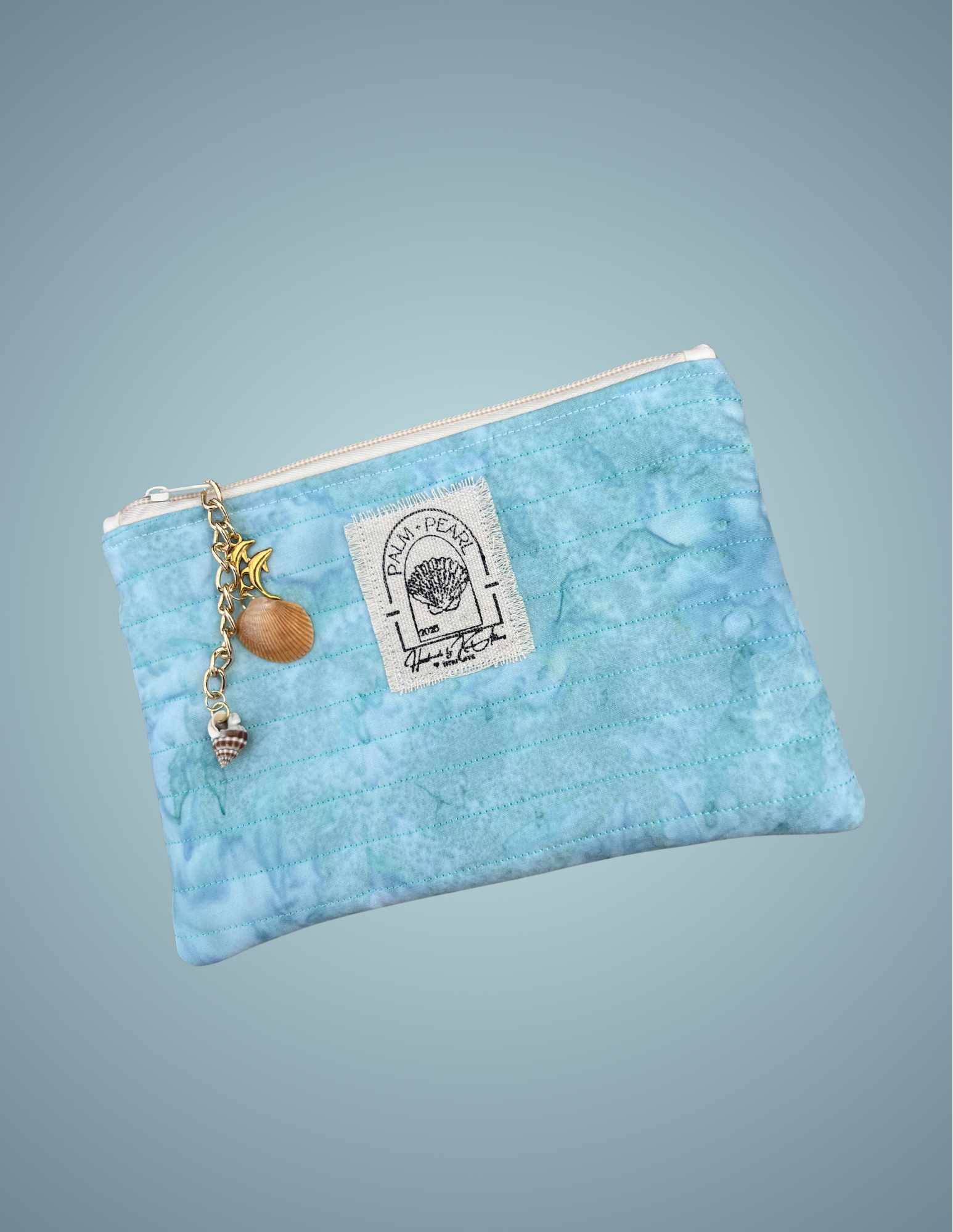 Handmade and one-of-a-kind, the Tidal Wash pouch is crafted from soft cotton batik in flowing teal and blue watercolor tones, reminiscent of gentle ocean tides. This medium-sized quilted zip pouch is perfect for organizing everyday essentials—makeup, tech accessories, or on-the-go treasures. Finished with a coastal-inspired seashell zipper charm, it’s both practical and a little piece of seaside serenity you can carry anywhere.