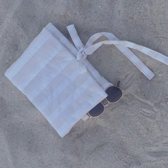 Protect your favorite reads and tech in style with this soft, beachy quilted sleeve. Featuring the same warm tan stripes as our Sun, Sand & Stripes tote, this padded pouch is designed to keep your essentials safe — whether you’re tossing it in your beach bag or heading to a café for a quiet read.