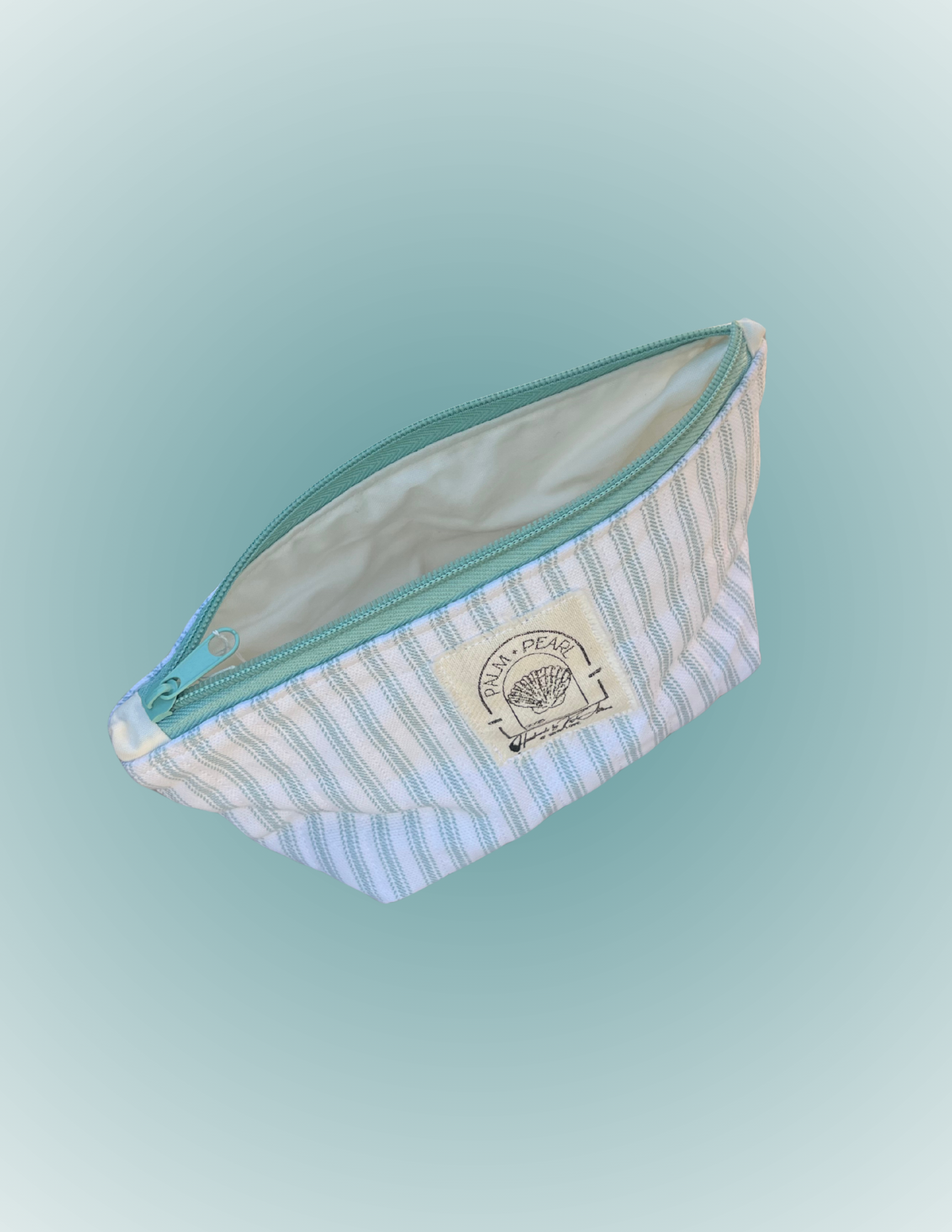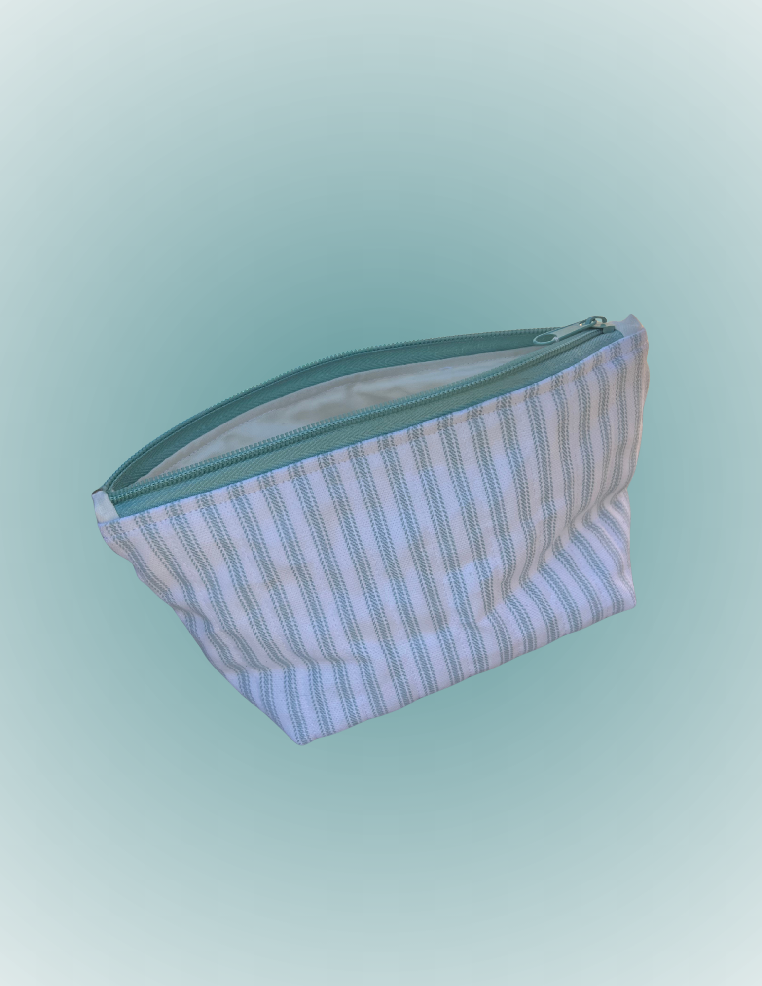 Fresh and coastal, this pouch features soft white fabric with delicate teal-green pinstripes, creating a breezy, seaside-inspired look. Designed with boxed bottom corners, it stands upright on its own, making it perfect for storing cosmetics, small accessories, or everyday essentials in style.