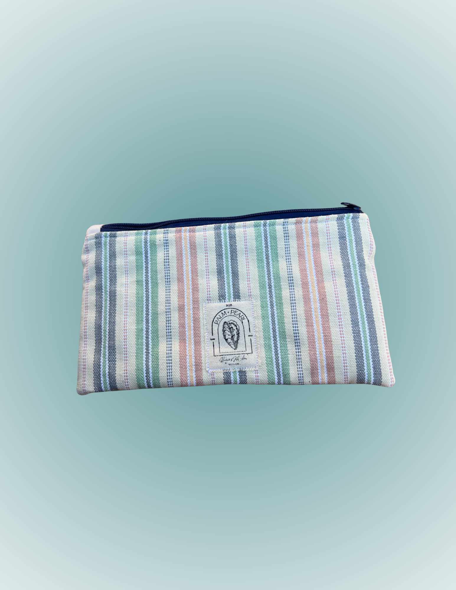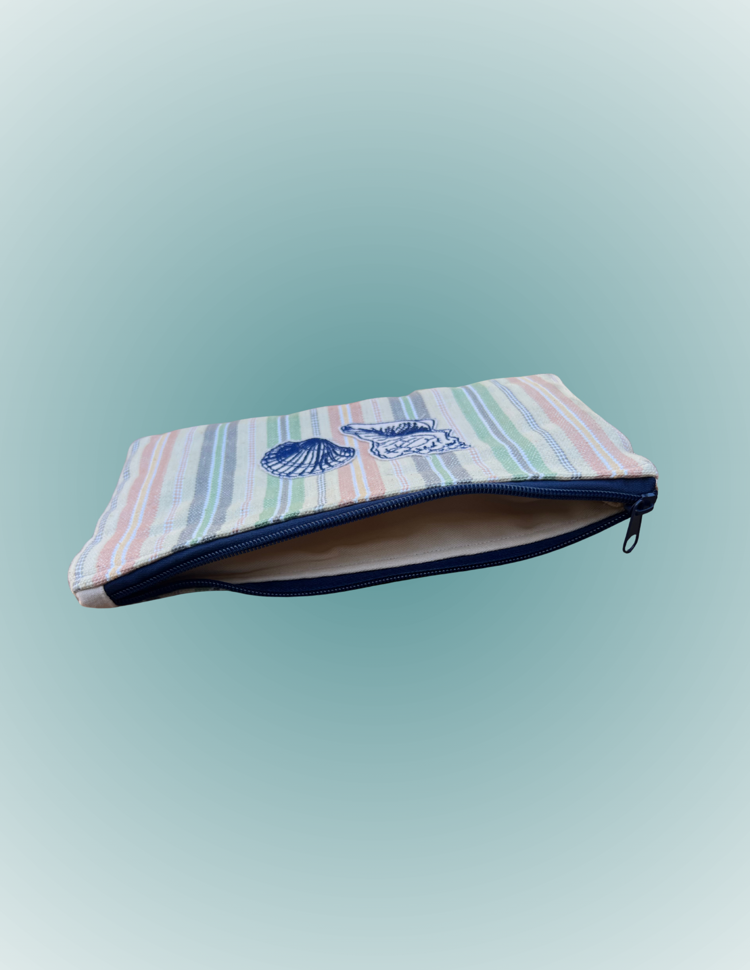 Nostalgic and coastal, this pouch features muted green, peach, and blue stripes with a touch of vintage charm, accented by hand-embroidered seashell patches for a playful seaside detail. Perfectly sized for sunglasses, small accessories, or everyday essentials, it adds both style and function to your coastal-inspired collection.
